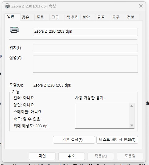 - 프린터 속성 → “테스트 페이지 인쇄” 선택